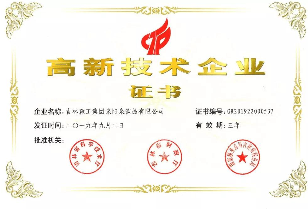 ? ? ? 根據(jù)科學(xué)技術(shù)廳、吉林省財(cái)政廳、國家稅務(wù)總局聯(lián)合頒布的《關(guān)于公布吉林省2019年第一批國家高新技術(shù)企業(yè)認(rèn)定結(jié)果的通知》,經(jīng)過層層審核,吉林森工集團(tuán)泉陽泉飲品有限公司由吉林省科學(xué)技術(shù)廳、吉林省財(cái)政廳、北京市國家稅務(wù)局、國家稅務(wù)總局吉林省稅務(wù)局局聯(lián)合批準(zhǔn)下發(fā)的高新技術(shù)企業(yè)認(rèn)定。